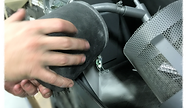 Ceramic bead blasting media, while costing a lot per pound, is actually very inexpensive to run because of its extreme longevity. Unless that is, you lose it to the dust collector, where it becomes contaminated with dust and debris. We solved this problem with a static-dissipative cyclone – and now only the fine dust makes its way to the dust collector. Good ceramic bead is captured in the cup attached to the bottom of the cyclone. Once or twice a day the operator simply unclamps the lightweight cup – where the good media accumulates – and pours it back into the blast system (as shown). With the dust extracted, he is reusing only good shot.